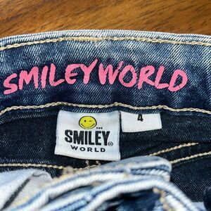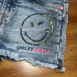 Trendy Girls Size 4T Denim Smiley World Mini Skirt Featuring A Playful Smiley Face Design. Perfect For Adding Fun To Any Outfit In Very Good Condition