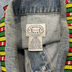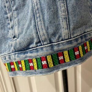 **Color & Design:** The medium-wash denim color provides a classic look that is enhanced by colorful embroidered detailing along the collar and hem. This vibrant embroidery adds a touch of personality and flair, reminiscent of the rock and hippie vibes of the era.