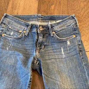 In excellent condition! Factory distressed and aged, medium wash. Classic 5 pocket style, zip/button closure. Skinny jeans with a low waist. Top of waist measures approx 14" across, 7" rise, 31" inseam.