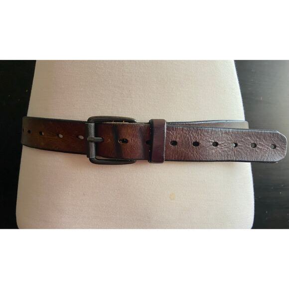 DENIZEN Distressed Brown Perforated Leather Belt Mens size L. Featuring a sturdy distressed leather strap, perforation throughout and a bronze roller buckle.