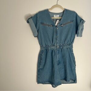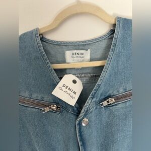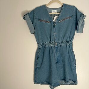 Stylish denim blue jumpsuit featuring zipper pockets and rolled sleeves. Perfect for casual outings.