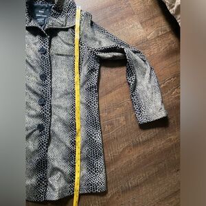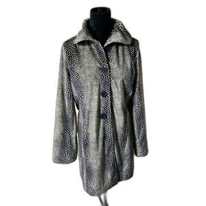 This soft dressy women’s jacket “Dennis by Dennis Basso” is a size small and gorgeous. It is a snake skin style animal print design on a soft but not overly thick fur-like polyester. The coat is in excellent shape and seems like new.