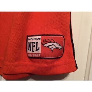 DENVER BRONCOS MEN'S SIZE SMALL ORANGE ATHLETIC SHORTS. ELASTIC WAIST WITH DRAW STRING, 2 POCKETS, 10" INSEAM. SCREENING ON INSIDE TAG IS COMING OFF, SEE PHOTOS.