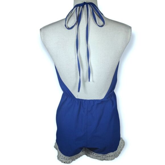 DEPRI ROYAL BLUE PLUNGE NECK ROMPER W/WHITE LACE SZ.M EUC. GORGEOUS ROMPER IN EXCELLENT USED CONDITION.