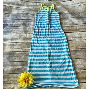 Derek Heart. Size (m) 10/12. Very good condition, minimal pilling. Sleeveless dress. Turquoise-white stripe with bright yellow trim. Cute bright yellow detail down back. 88% polyester. 12% rayon. Appox. 13” across. 46” length.