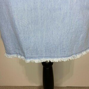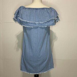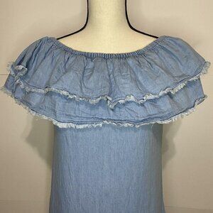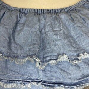 DEREK HEART SZ SMALL OFF THE SHOULDER DENIM RUFFLE SHIRT RAW HEM EUC.