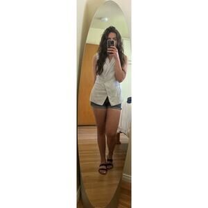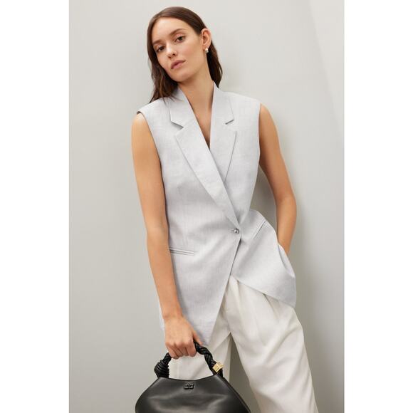 DEREK LAM 10 CROSBY Gray Linen Blend Sleeveless Taylor Vest Size 2. The Derek Lam 10 Crosby Taylor Vest is a sleek and sophisticated layering piece, crafted from a lightweight gray linen blend for a polished yet breathable feel. Designed in a sleeveless silhouette, this tailored vest features a structured fit with refined detailing, making it a versatile addition to any wardrobe. Perfect for pairing with trousers, skirts, or layering over a blouse, this Size 2 vest blends modern elegance with effortless style.