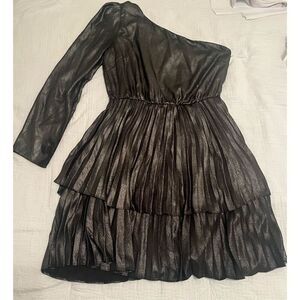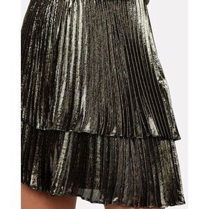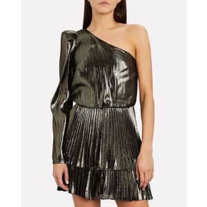 Flowing in liquid gold silk lamé, the label's Yolie mini dress is a stunner draped with a puffed one-shoulder and tiered knife pleated skirt. Side zip closure.