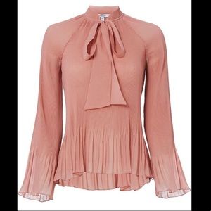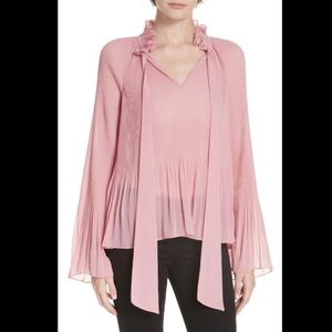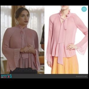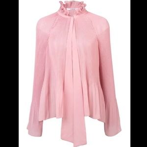 An oasis of softness and frills, this top transitions from pleats to ruffles, creating a peplum and bell cuffs, furthering the diaphanous style.