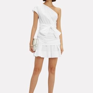 Cut from crisp cotton poplin, this navy one-shoulder dress is effortlessly gathered and pleated and features waist-defining ties. One shoulder neckline. Fitted bodice. Concealed side zip closure. Flounce hem. Lined.