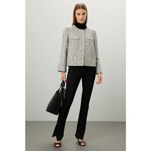 DEREK LAM COLLECTIVE Gray Gold Button Front Zip Up Sleeve Tweed Jacket is a sophisticated and versatile piece that merges classic tailoring with modern details. This jacket features a timeless gray tweed fabric, offering a textured and elegant look. The gold buttons along the front add a touch of luxury and contrast beautifully against the muted gray background. A unique feature of this jacket is its zip-up sleeves, which allow for adjustable styling and a contemporary twist on the traditional tweed jacket.