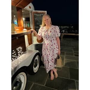 DEREK LAM COLLECTIVE White Purple Pink Floral Smocked Puff Sleeve Dress Size 48. The DEREK LAM COLLECTIVE White Floral Smocked Dress is a beautifully feminine piece with timeless charm. Featuring a delicate purple and pink floral print, this dress is designed with a flattering smocked bodice and elegant puff sleeves for a romantic touch. The lightweight fabric enhances its effortless appeal, making it perfect for daytime outings, garden parties, or special occasions. Crafted in Size 48, this dress blends comfort and sophistication for a graceful, polished look.
