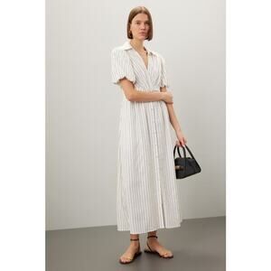 DEREK LAM COLLECTIVE White Stripe Linen Collar Knot Waist Shirt Dress Size 42. Derek Lam Collective White Stripe Shirt Dress, a sophisticated piece crafted from breathable linen for ultimate comfort. Designed with a collared neckline and a button-front closure, this dress offers timeless shirt dress styling. The knotted waist detail cinches the silhouette, creating a flattering hourglass effect, while the subtle stripe pattern adds a touch of classic charm. Perfect for both casual outings and semi-formal occasions, pair this versatile dress with sandals or heels for an effortlessly chic look.