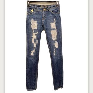 DEREON JEANS Skinny Distressed 8” Rise Embroidered Pre-Owned Size 5/6 Back logo patch on back is removed-see photos. Nice condition. Waist measures approx 26” wide Inseam 31” long.