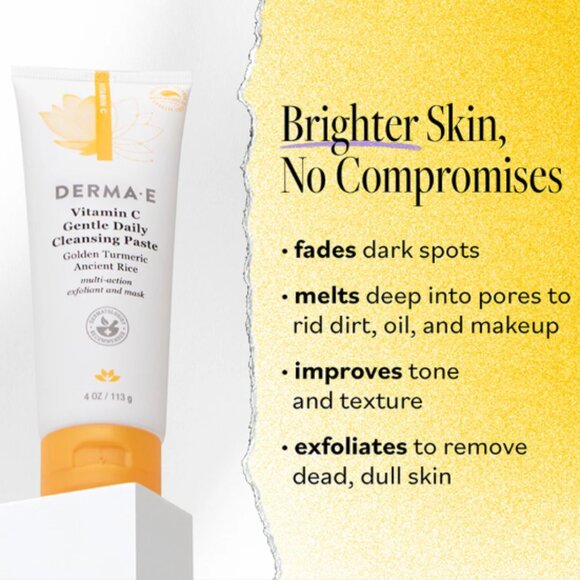 Introducing the DERMA E Vitamin C Gentle Daily Cleansing Paste, a skin-brightening, antioxidant-rich facial cleanser, and mask that gently exfoliates to unveil soft, smooth, and radiant skin. This multi-tasking polish paste is your new skincare essential for a luminous complexion.