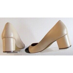 This product is a designer J. Crew beige and black two-tone round toe block heel pump in size 8.5M.