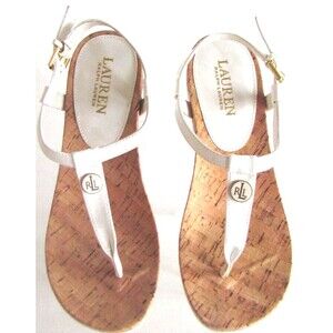 DESIGNER LAUREN RALPH LAUREN WHITE PATENT LEATHER CORK WEDGE HEEL SANDALS 8.5 M