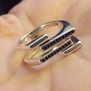 DESIGNER MINIMALIST *NEW* BLACK CRYSTALS THIN SILVERY BYPASS SZ 6 RING 69
