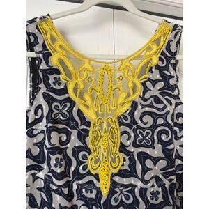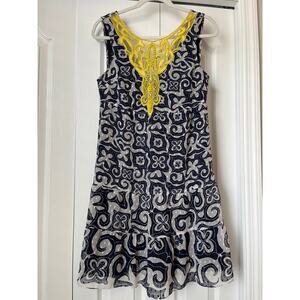Gorgeous dress with beaded yellow lace front and back detail. Navy/white abstract print with tiered design. Size 36/ 4 US. Pristine condition. Slips over the head.