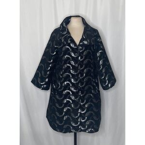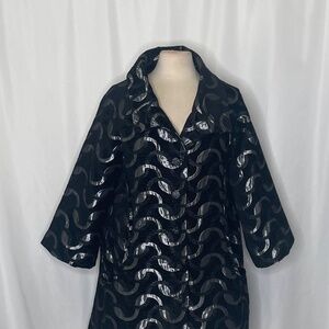 Point collar at neckline … this can be buttoned up high or laid flat ~ Three-Quarter to full length sleeves ~ Bead embellished button closures down the front ~ Two large inset curved pockets on the lower front ~ Straight hemline ~ Fully lined ~ Exterior shell is a woven jacquard fabric ~ Pattern is an interlinking circle print in shades of black & silver … the silver has a metallic shimmer