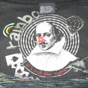 Desigual long-sleeve top with graphic front and inner backing; striped back and sleeves. The front also features a beaded "Rainbow" graphic and glitter accents, as well as an asymmetrical neckline. Some minor pilling throughout.