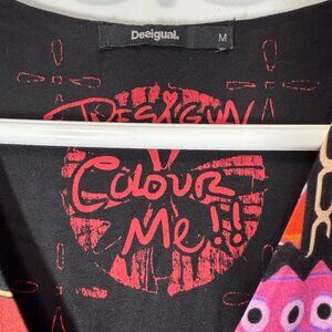 Vibrant patchwork design with a V-neck. Features multicolor patterns on top. Flowy black skirt.