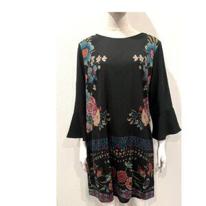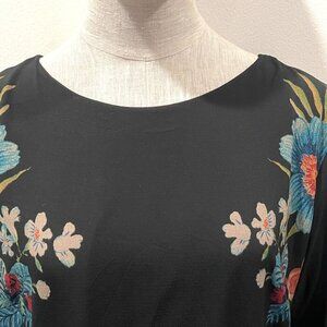 DESIGUAL BIRD FLORAL PRINT DRESS IN A MARKED 46- FITS A U.S S/M. THE DRESS FEATURES A BLACK BODY WITH A GORGEOUS BIRD AND FLORAL DESIGN WITH A BACK SHOULDER ZIP WITH STITCHING AT THE BACK AS SHOWN.