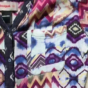 DESIGUAL Roll Tab Sleeve Semi Sheer Multi Color Aztec Pattern Menorca Style Crochet Lace Button Up Blouse Top Women Medium Retail $125