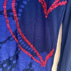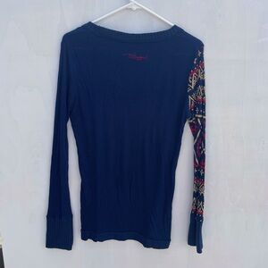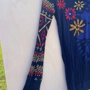 DESIGUAL Women’s Graphic Top Long Sleeve Blue Floral Viscose - SZ M. Beautiful jewel tones and embroidered with beads. Beautiful jewel tone blue. Label showing fabric has pulled off in the corner as photo depicts. Last three photos show measurements chest, pit pit then length hanging. Product is in preowned excellent condition.