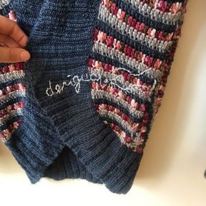 Unique open front cardigan, perfect for fall or chilly summer nights! Really unique design with "Desigual" embroidered in silver on lower left hip.