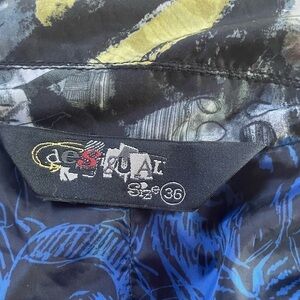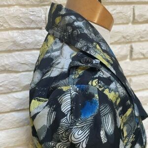 Unique gray, yellow black floral/graffiti/geometric print. Contrasting blue on cuffs and interior (see pics)
