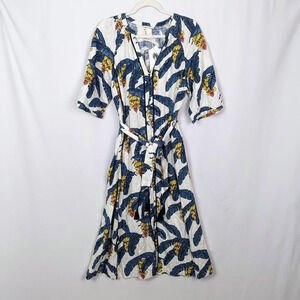 DESMOND & DEMPSEY H&M S Linen-Blend Kaftan Midi Belted Button Up Tropical Dress