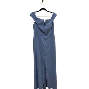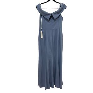 A center slit lends the perfect bit of sexy appeal to this full-length formal dress with a V-notch, off-the-shoulder neckline. A full trumpet skirt lends elegant movement and energy to stunning crepe fabric construction.