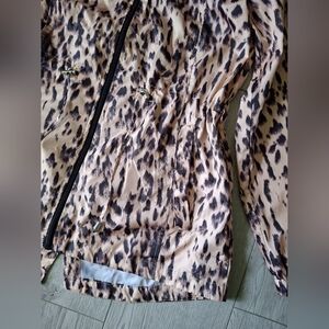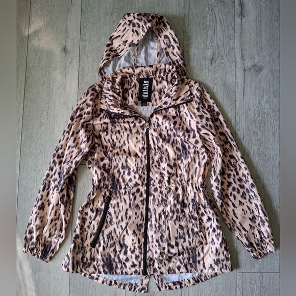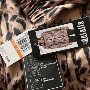 Stylish and fun, this leopard print jacket by D.E.T.A.I.L.S is perfect for any adventure. The black and tan design adds a trendy touch to your wardrobe. Great spring time windbreaker type material. Drawstring around the waist for a nice hour glass figure. This jacket is foldable for easy carrying. Unzip pocket, fold jacket into the pocket, pack and go. *This jacket is not new with tags. My picture with the tag was found on Google images.*