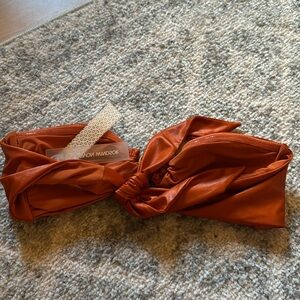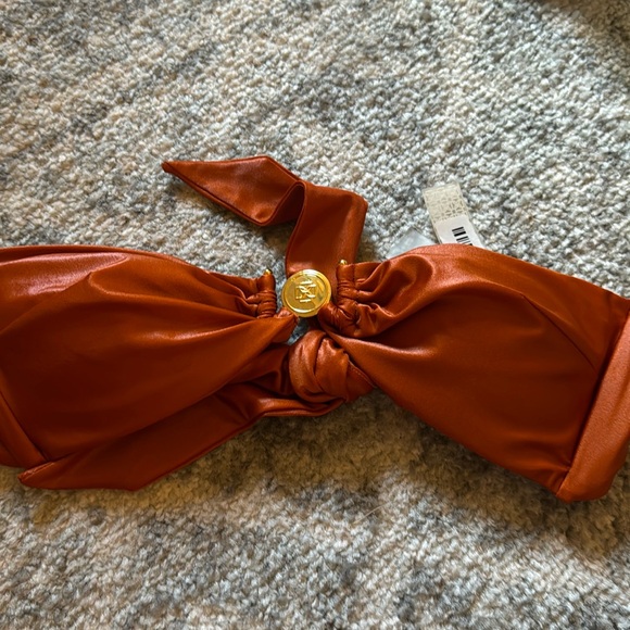 Stylish rust bikini top with a chic knot design. Features a gold accent for added elegance. Perfect for beach days.