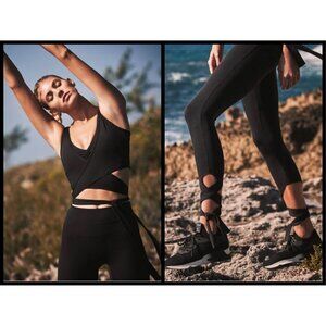 The Ellie is a plunging v-neck top with an adjustable, wrap-around tie. The Sophia leggings are high-rise fit with ties at the leg opening.