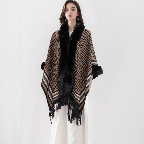 An everlasting stylish layer, this shawl features a striking faux fur collar paired with a classic Greek key print. The perfect transition piece for Fall.