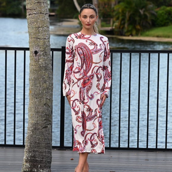 DEVORAH'S SECRET Modest Midi Dress Paisley White/Hot Pink/Coral / Regular& Plus