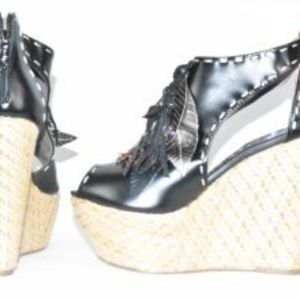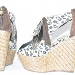 Adorable wedges with leaf charm. With two styles to choose from, Devour will make you the center of attention at your next gathering. It includes a peep toe and zipper in rear. This shoe hugs your feet; you will thank us later. Very comfy. Available in black and leopard. Leopard sizes available are 6, 8, 8.5, 10 (listed). Black sizes available are 9, 10.