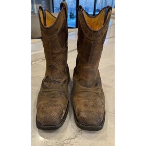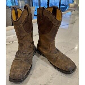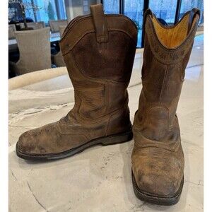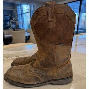 DEWALT Men's Stanton Waterproof Wellington Work Boots feature a steel toe for protection. The brown leather boots have a square toe and a pull-on style. With a mid-calf shaft, these boots are designed for casual wear and come in a US size 11.5. The outsole is made of rubber for durability, and the lining and insole are fabric. These boots are crafted for comfort and safety in a work environment.