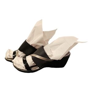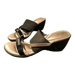 DEXFLEX Women's "Roberta" Black Silver Metallic Strappy Wedge Sandals sz 9.5