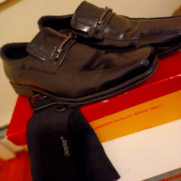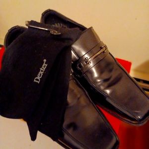 MEN'S SIZE 10 1/2 DEXTER COMFORT SLIP ON DRESS SHOES THIN METAL BUCKEL TO MATCH ANY FORMAL OCCASION .COLOR ALL BLACK WITH FREE BLACK DEXTER COMFORT DRESS SOCKS WITH ORIGINAL BOX