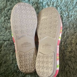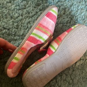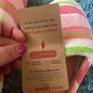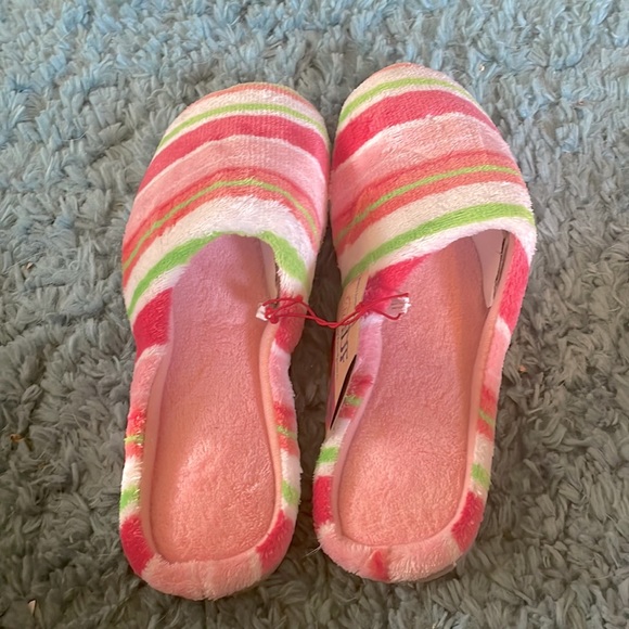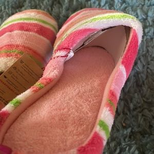 DF by Dearforms Women's Slippers Colorful pinks, white and green stripes Hard bottoms Size XL - Women's 11/12 New with Tags