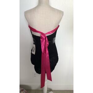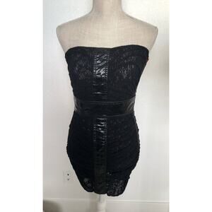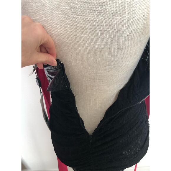 This dress is fully of details and is the perfect Y2K or 90s throwback style. It is a black lace mini dress that is unlined, perfect for the naked dress trend. It has a strapless neckline. There is a vinyl accent that makes a cross across the front and goes to the back. The sides have boning inserts to give shape. The back has a hot pink ribbon tie. The ribbon end has a little fray and wear but is easy to cut if you want. Hidden zipper and hook and eye closure in the back. This dress has some stretch, so it accents your curves. New with tags.