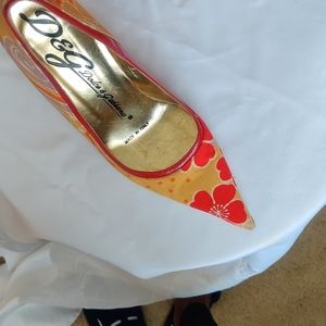 D&G red and mustard fabric and leather trim. There are visible signs of wear mainly on the soles. The red circle on the bottom of shoe shows the size 40. The heel size is appropriately 3.5". There are in great condition. All of my items will be video prior to shipping.