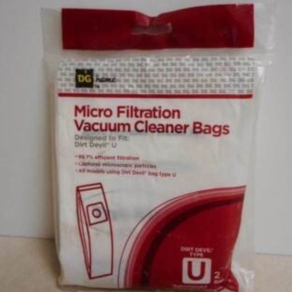 This is BRAND NEW FACTORY SEALED name brand DG HOME 2 MICRO FILTRATION VACUUM CLEANER BAGS FOR DIRT DEVIL TYPE U. This is for all models using Dirt Devil bags type U. This is ideal for those who suffer from dust-related or allergic discomforts.