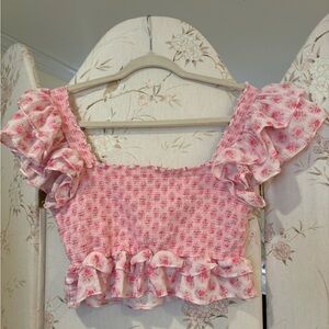 Dolce & Gabanna pink top with delicate lace accents. Features adjustable straps and a flowing silhouette. This fits a US Size 4-6.