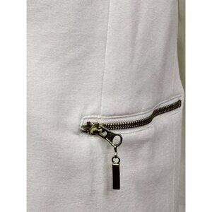 This chic white blazer adds sophistication to any wardrobe. Its zippered pockets offer convenience while maintaining a sleek appearance.