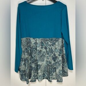 New with tags super soft DG2 by Diane Gilman Women Large Teal Blue Crew Neck Flowy Paisley Long Sleeve Hi Lo Top.