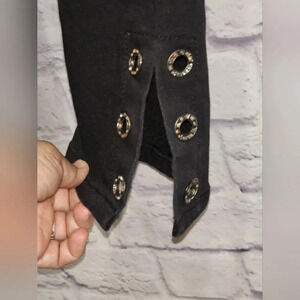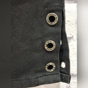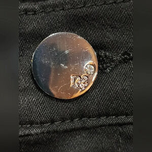 These DG2 jeans are black, ankle length and have a straight leg fit. They feature a classic five-pocket design, belt loops, and silver hardware. The jeans have a unique detail on the outer side of the leg opening with small grommets.